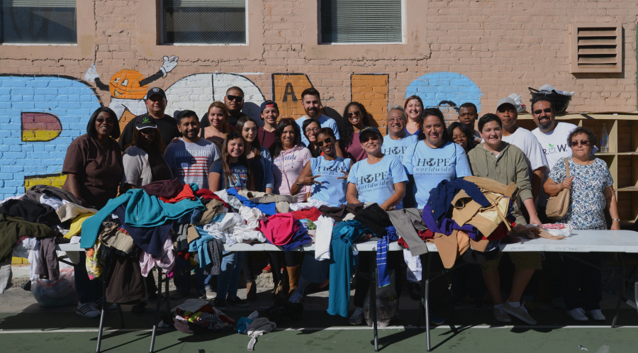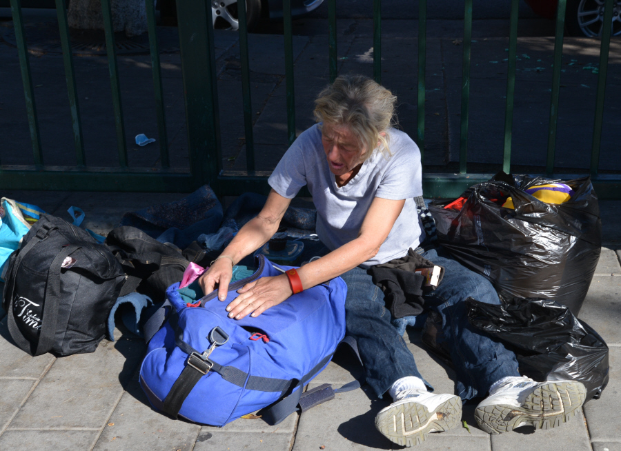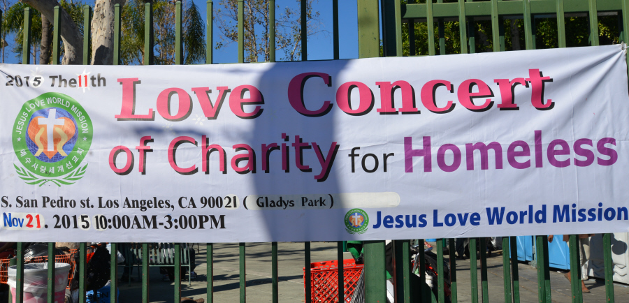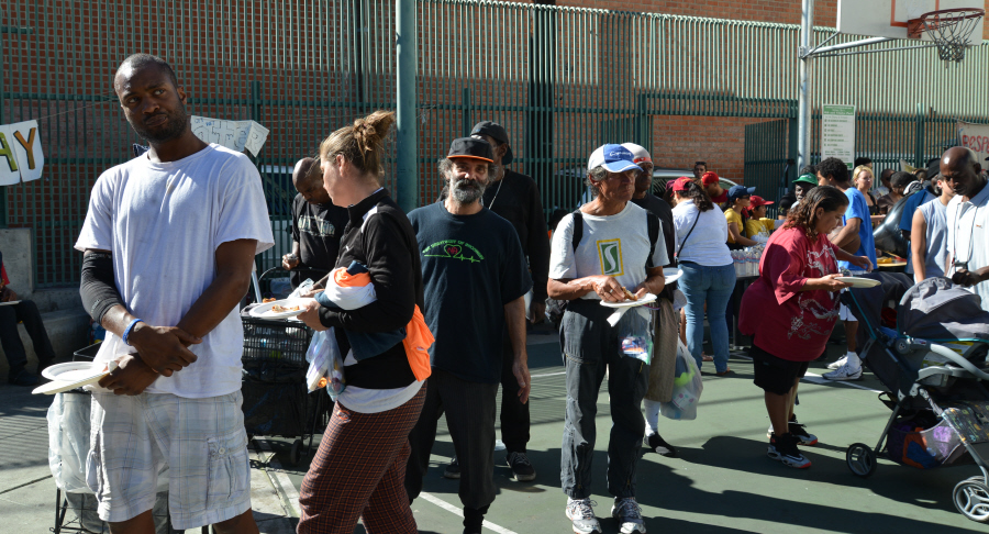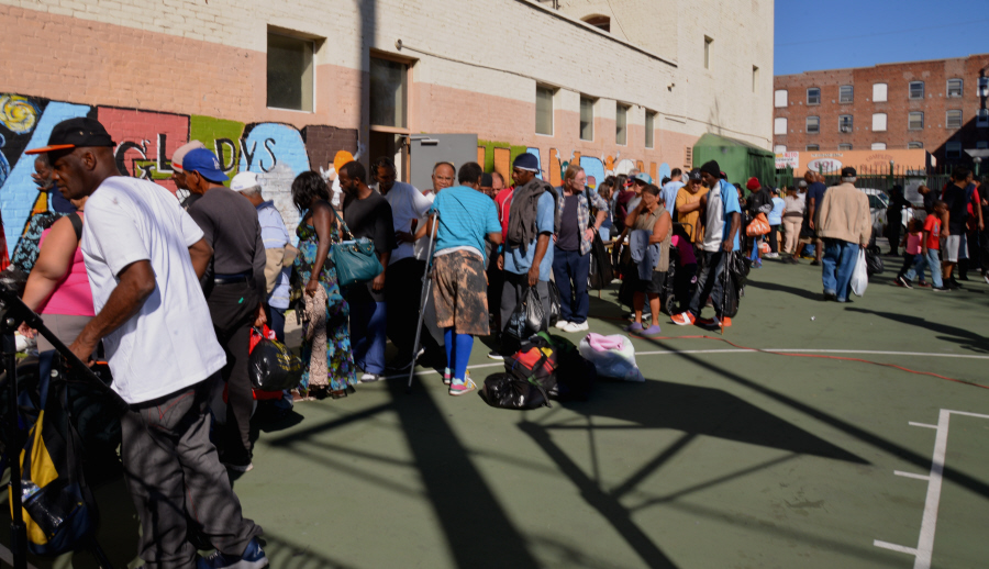 노숙자들이 음식과 필요한 물품을 받기위해 긴줄을 서고있다