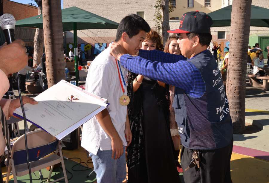 자원봉사를 통해 선행을 한 학생을 표창하는 조병국 대회장 목사님
